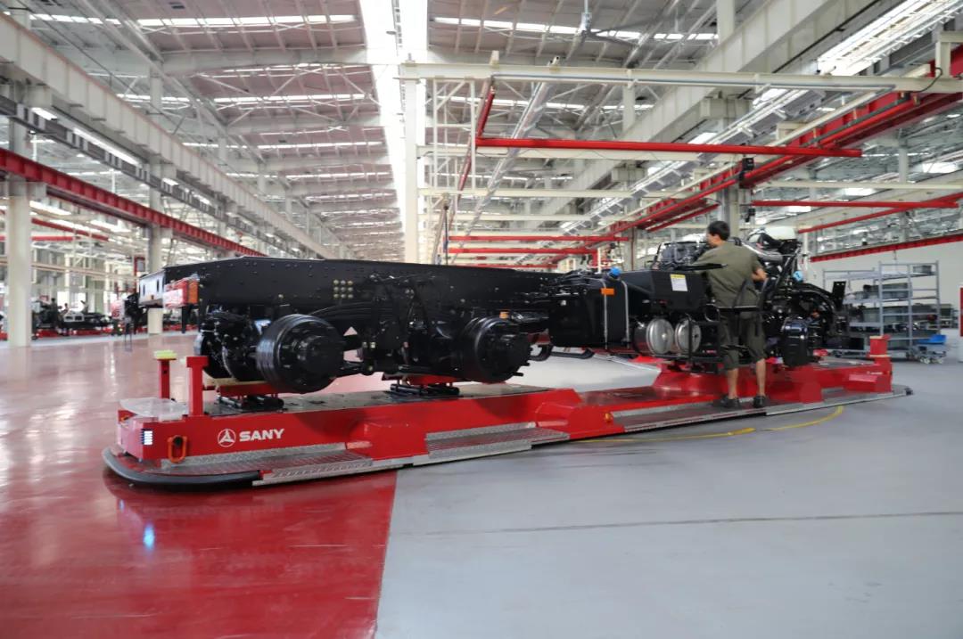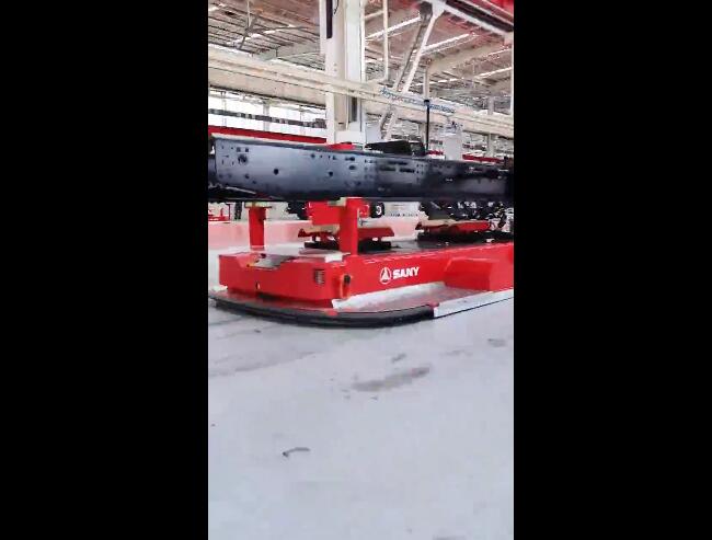 三一重卡“超級試驗工廠”其主線配備43臺大型定制裝配AGV,單臺承重超過10T,可實現1m/min~30m/min無級變速。相較傳統拖鏈裝配線具有高度的柔性化。是實現裝配自動化的基礎。