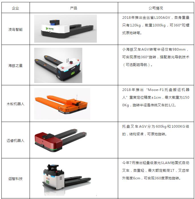 凌鳥智能 | | 2018年推出金絲雀L100AGV,自身重量只有120kg,載重1000kg,可360°陀螺式原地轉彎。 |