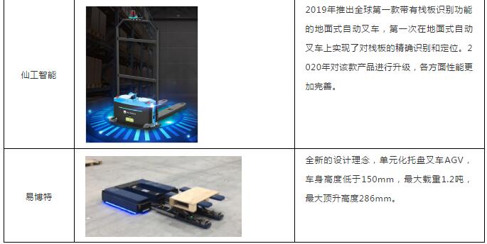 仙工智能 | | 2019年推出全球第一款帶有棧板識別功能的地面式自動叉車,第一次在地面式自動叉車上實現了對棧板的精確識別和定位。2020年對該款產品進行升級,各方面性能更加完善。 |