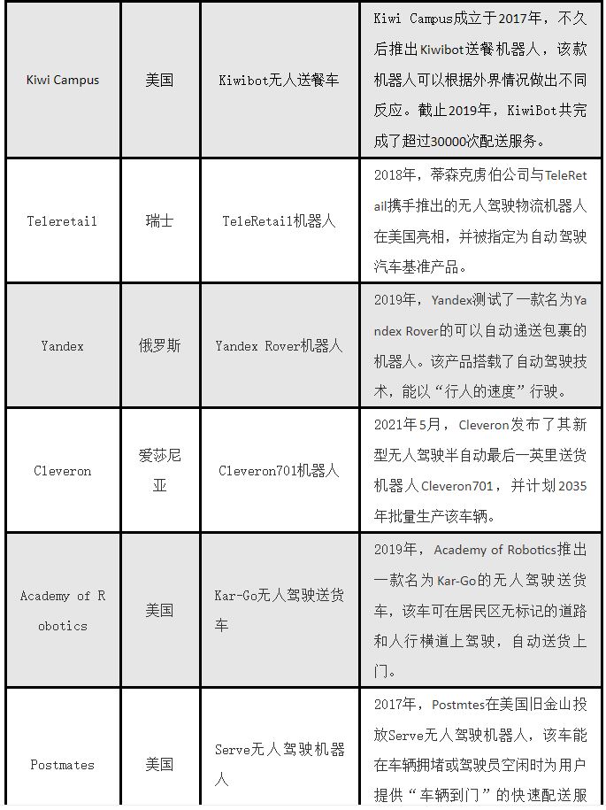 從表中列舉企業可知,目前國外布局“無人配送移動機器人”的企業多以歐美國家為主,其次,快遞、外賣、物流仍然是當前“無人配送”最受歡迎的應用場景。然而,隨著社會的發展,生鮮和藥品等商超零售品應用,也正在成為無人配送在快遞和外賣之外的另一個落地場景。