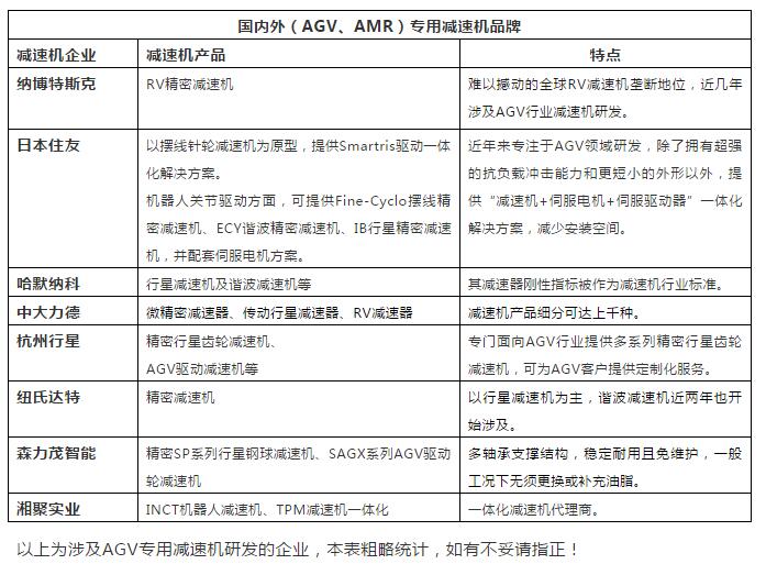 國(guó)外在先進(jìn)減速機(jī)的設(shè)計(jì)生產(chǎn)上已經(jīng)十分成熟,而工業(yè)機(jī)器人減速機(jī)生產(chǎn)企業(yè)主要是日本公司。隨著AGV應(yīng)用范圍越來越廣以及市場(chǎng)的不斷擴(kuò)大,產(chǎn)業(yè)鏈上游的核心零部件廠商也在伺機(jī)而動(dòng),從2017年開始,全球頂尖的三大減速機(jī)巨頭(住友、納博特斯克、哈默納科)就已紛紛開始針對(duì)AGV行業(yè)開發(fā)特定產(chǎn)品,將減速器與電動(dòng)機(jī)的連體結(jié)構(gòu)并已生產(chǎn)多種結(jié)構(gòu)形式和多種功率型號(hào)的產(chǎn)品陸續(xù)向AGV行業(yè)推出,這些產(chǎn)品不但打破了AGV高精度減速機(jī)單調(diào)的選型方式,更是開創(chuàng)了驅(qū)動(dòng)一體化減速機(jī)應(yīng)用到AGV行業(yè)的創(chuàng)新解決方案。其中,以日本住友的擺線針輪減速機(jī)的推出,將AGV減速機(jī)的全新探索推向高潮。