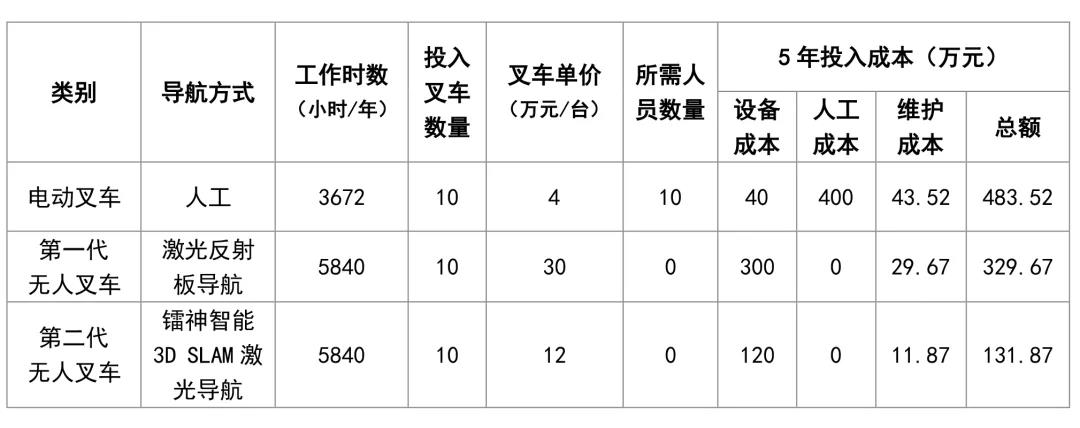 上表假定了某倉庫分別投入10輛電動叉車、激光反射板導航叉車、3D SLAM激光導航叉車,并以5年折舊進行投資回報對比分析。顯然,人工操作的電動叉車投入成本最高,經濟回報效益最低;激光反射板導航叉車雖然單臺叉車成本高,但在五年折舊期后總投入還是比人工的電動叉車要節省了153.85萬元,近32%的成本;而采用鐳神智能3D SLAM激光導航方案的無人叉車,五年總投入成本僅131.87萬,比人工電動叉車節省了73%的投入成本、59%的時間成本,而且五年期間倉庫可以靈活進行擴建或調整,全面滿足工業互聯網時代下客戶終端市場隨時變化的需求,具有更突出的綜合效益!