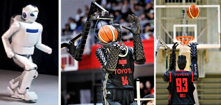 2009年豐田發布了第二代會跑步的機器人,他的跑速可以達到每小時7公里,當然必須在平坦無障礙的路面跑,還有一款叫CUE4的可以投籃球的機器人。