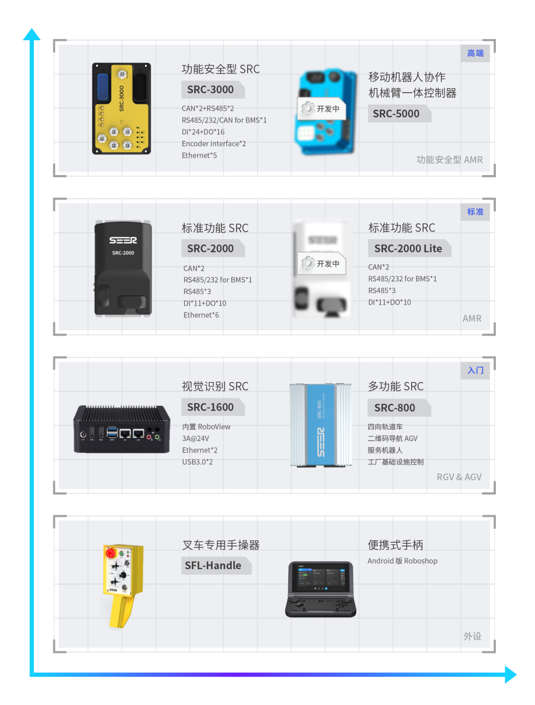 SRC 系列核心控制器是為移動機器人(AGV、AMR、自動叉車等)設(shè)計的通用控制器,為移動機器人提供地圖構(gòu)建、定位導(dǎo)航、模型編輯等核心功能。