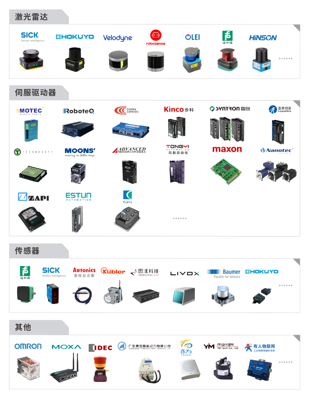 SRC 核心控制器功能強大,適配廣泛,已完成和各大傳感器、驅(qū)動器廠商的產(chǎn)品適配,并繼續(xù)和他們密切合作,共建 AMR 的產(chǎn)業(yè)生態(tài)。