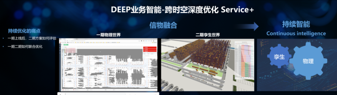 在持續(xù)優(yōu)化方面,Service+通過讓一期物理世界和二期孿生世界,實現(xiàn)信物融合,從而獲得持續(xù)智能,解決了二期方案評估,以及一期二期聯(lián)合優(yōu)化的問題。