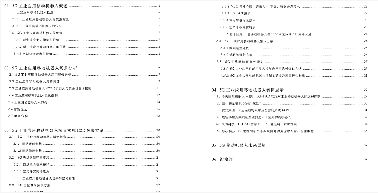 本藍(lán)皮書從5G工業(yè)應(yīng)用移動(dòng)機(jī)器人的發(fā)展背景出發(fā),給出5G工業(yè)應(yīng)用移動(dòng)機(jī)器人的定義和價(jià)值,分析各種應(yīng)用場(chǎng)景對(duì)網(wǎng)絡(luò)的需求,從架構(gòu)、網(wǎng)絡(luò)、終端提出5G工業(yè)應(yīng)用移動(dòng)機(jī)器人可落地的解決方案,闡述可靠性能力,并給出各個(gè)應(yīng)用場(chǎng)景落地實(shí)施的建議,幫助產(chǎn)業(yè)鏈各方共同推進(jìn) 5G 智慧物流發(fā)展。