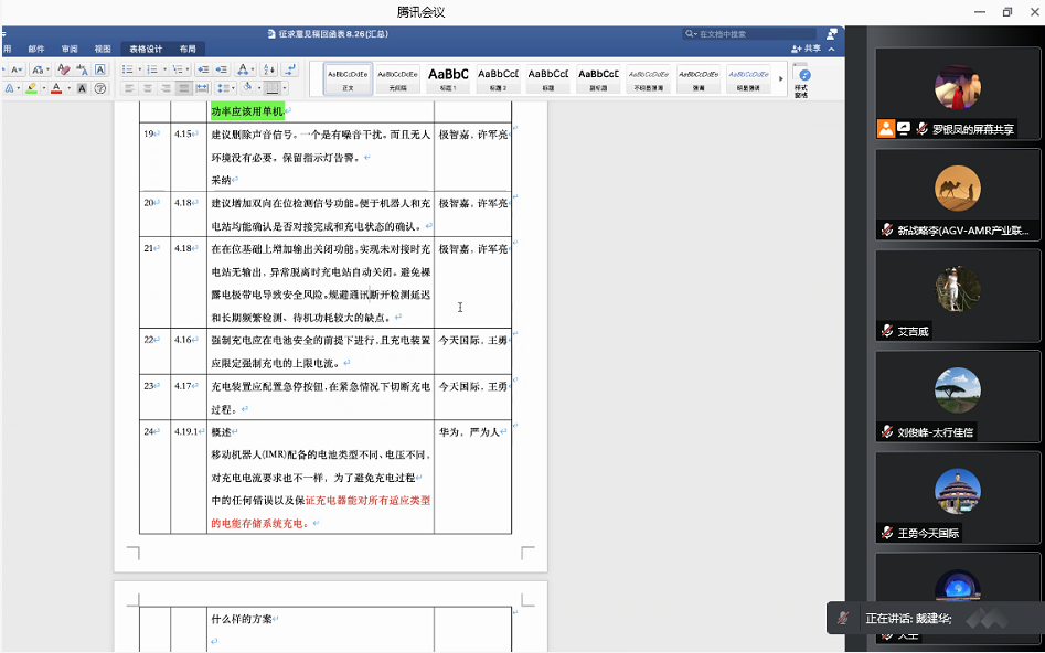 會上,就《工業應用移動機器人 配套件應用技術規范-充電裝置》初稿進行討論,每家企業以及專家都提出了各自修改意見,對標準的修改意見進行了重點討論并達成一致。同時各位專家也闡述了標準技術內容、關鍵問題處理、與現行有關的國家標準的差異等,并建議工作組根據專家審查意見對標準進行修改完善,盡快形成送審稿,報請CMR產業聯盟聯盟團體標準管理委員會發布實施。