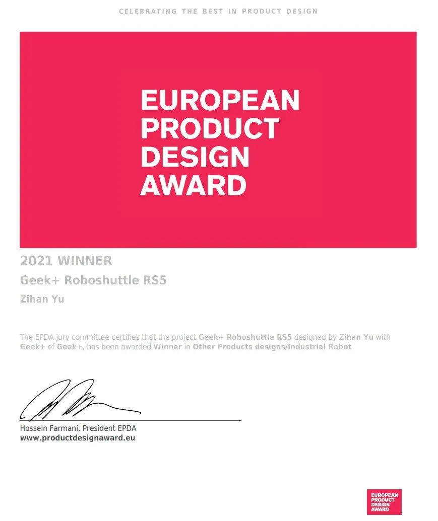 近日,歐洲著名設計大獎歐洲產品設計獎(European Product Design Award?)正式揭曉2021年度獲獎名單。全球AMR引領者極智嘉(Geek+)憑借其引領業界的RS5“貨箱到人”機器人產品設計成功登榜,是唯一一家上榜的AMR企業。獲此殊榮充分彰顯了RS5貨箱機器人的業界領先性,同時也是極智嘉長久以來堅持自主設計,重視產品品質的強有力背書。