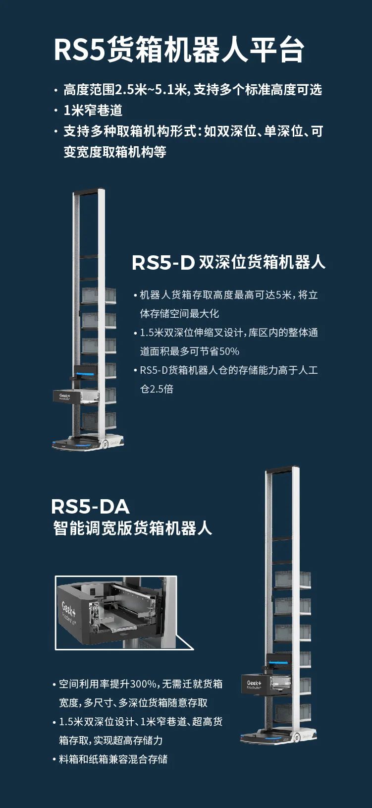 此次獲獎的雙深位、窄巷道、廣立體覆蓋的RS5貨箱機器人屬于極智嘉RoboShuttle®貨箱到人系列,該系列是極智嘉打造的集高存儲、高效率、高柔性和高性價比四大特點于一體的貨箱到人揀選系統。