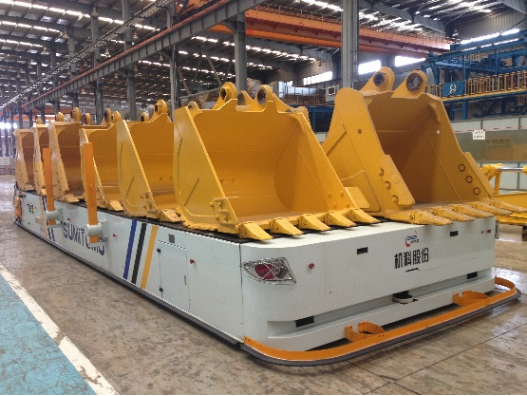 國內第一條實現(xiàn)重卡AGV單機背負磁條導航的自動化產(chǎn)線,采用低車身結構設計,方便操作人員上下車與AGV隨行裝配。實現(xiàn)整機的裝配柔性化,更好的適應廠房布局,對商用車/客車/軌道交通領域有示范作用。經(jīng)濟性:產(chǎn)線使用AGV輸送,可以有效減少對土建及鋼構的需求,減少前期的投資,更適應商用車/客車/軌道交通的新廠房的建設。產(chǎn)品升級換代或者優(yōu)化工藝時,如增加工位、修改節(jié)拍等,只需要調整AGV路徑或者數(shù)量即可,無需重新做基礎及鋼結構施工,可以更靈活方便地調整產(chǎn)線,二次投資更小。先進性:創(chuàng)新使用重載差速驅動懸掛技術,可以實現(xiàn)AGV前進、后退、橫移,同時可以在產(chǎn)線故障時,及時將車體移出,保證整線的生產(chǎn)及時性。某著名工程機械公司“超級試驗工廠”已投入生產(chǎn),這也是第一個全方位將AGV應用各類民用卡車制造領域的工廠,是重卡行業(yè)第一個全流程、全廠區(qū)內實現(xiàn)無人化物流轉運的工廠。做為重工行業(yè)的領導者,在其示范引領作用下,國內重卡制造領域必將迎來一次行業(yè)變革,推動行業(yè)提升智能制造水平,助力產(chǎn)業(yè)轉型升級。案例二:國自機器人某機械工程行業(yè)客戶大挖機生產(chǎn)線AGV搬運項目該項目客戶屬于工程機械龍頭企業(yè),目前公司主要生產(chǎn)大中小微挖機,產(chǎn)品廣泛應用于工程機械領域。車間共改造2條生產(chǎn)線,挖機上車架線路原老式軌道RGV更新升級替換為全柔性AGV環(huán)線,實現(xiàn)工位柔性化,自動和手動并行升級。挖機下車線原老式滑觸線RGV改為電池式免維護舉升RGV,滿足下車裝配工藝升級。