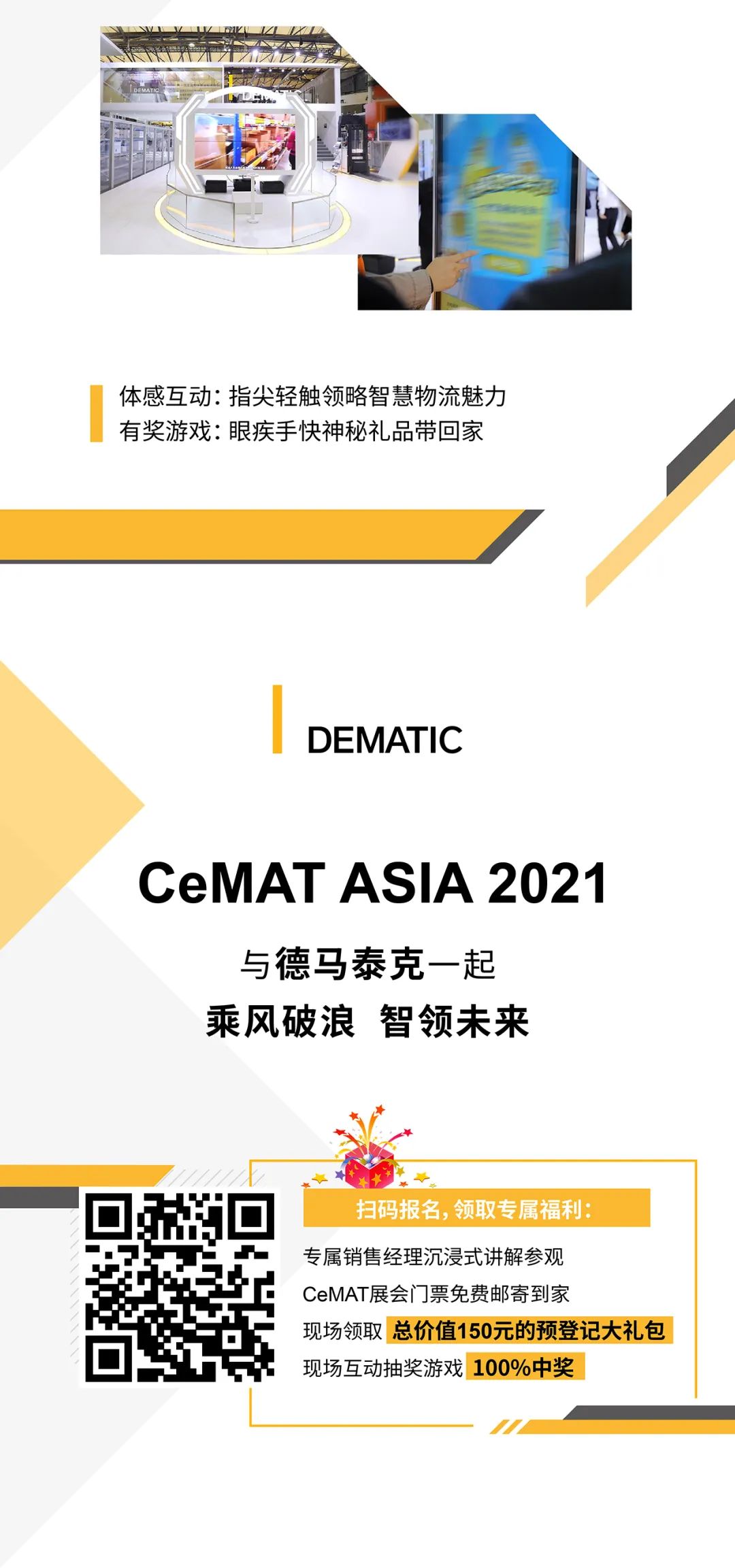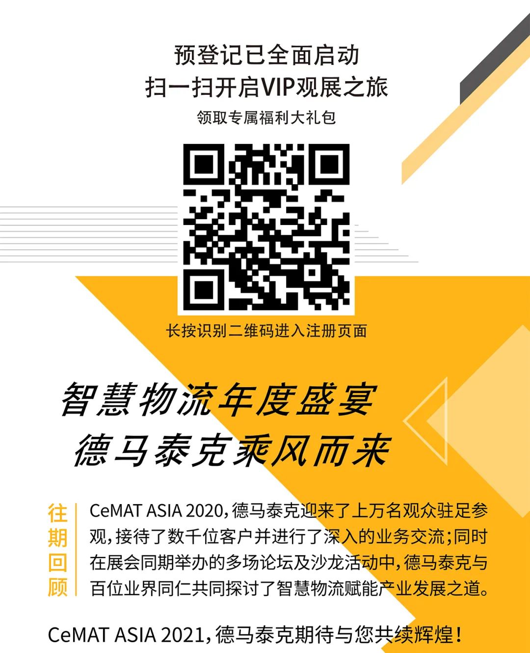 預(yù)約成功后,展會(huì)現(xiàn)場(chǎng)打開“德馬泰克”微信公眾號(hào)→“媒體中心”→“CeMAT 預(yù)約”頁(yè)面并登陸,到W1館B4德馬泰克展位前臺(tái)出示給工作人員領(lǐng)取。