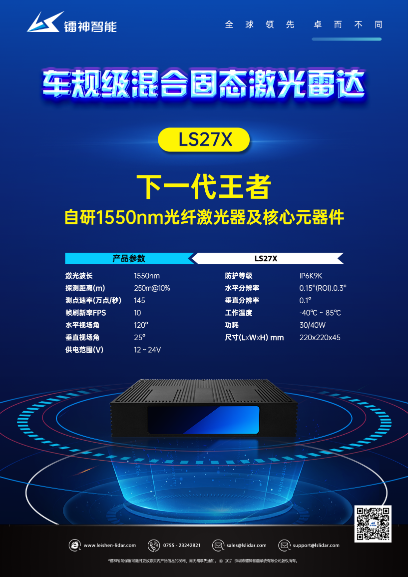 采用自研的1550nm光纖激光器和核心元器件的下一代王者——LS27X車規(guī)級混合固態(tài)激光雷達即將面世!