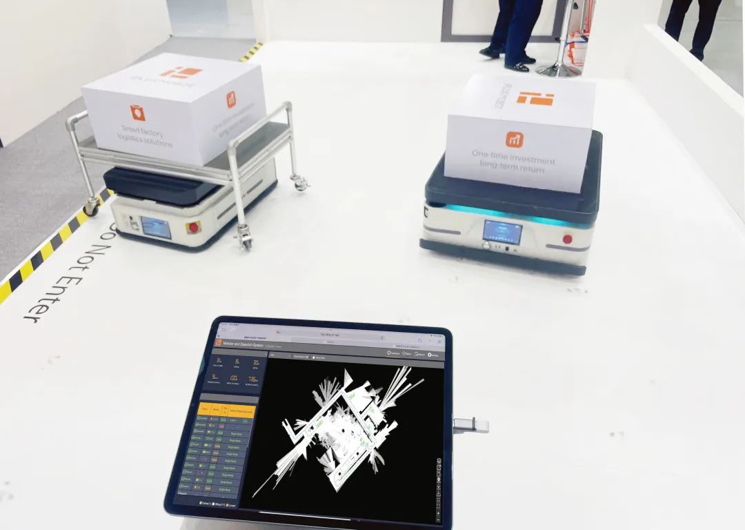 展會現場,采用迦智自研融合導航技術的EMMA移動機器人車隊,對接不同料架,在多機器人調度管理系統的統一管控下,結合智能的控制算法,準確、高效地完成物料的柔性周轉。