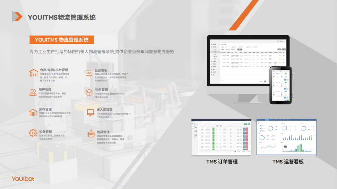 在移動(dòng)機(jī)器人基礎(chǔ)上,優(yōu)艾智合智慧物流管理系統(tǒng)YOUI TMS與企業(yè)MES、WMS等信息化系統(tǒng)對(duì)接,100%追蹤回溯每一件物料信息,完成物料從備料倉(cāng)到產(chǎn)線再到成品倉(cāng)的完整閉環(huán),在提質(zhì)增效的基礎(chǔ)上幫助企業(yè)實(shí)行柔性生產(chǎn)與數(shù)字化管理。