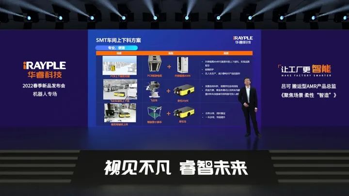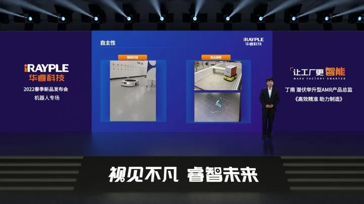 華睿科技潛伏舉升型AMR產(chǎn)品總監(jiān)丁南在本次發(fā)布會上以“高效精準(zhǔn) 助力制造”為主題的演講。他表示:“潛伏舉升型AMR作為目前業(yè)內(nèi)最常用的AMR類型,通過不斷挖掘不同行業(yè)客戶的需求,除了滿足原有的電商倉儲行業(yè)外,在新能源,汽配,屏顯,重工等行業(yè)也得到了廣泛的應(yīng)用。”全新推出的新一代600KG潛伏舉升型AMR,在續(xù)航,效率上較上代產(chǎn)品得到了大幅提升,同時(shí)通過安全傳感器、識別算法、導(dǎo)航算法、調(diào)度算法的智能融合,實(shí)現(xiàn)了整車的360°避障和立體避障,加強(qiáng)了產(chǎn)品安全性,模塊化設(shè)計(jì),可根據(jù)實(shí)際項(xiàng)目、場景需要,靈活調(diào)整產(chǎn)品配置,滿足不同行業(yè)客戶的需求,升級了多種實(shí)施工具,降低了現(xiàn)場實(shí)施、維護(hù)設(shè)備的難度,讓用戶使用更簡單。