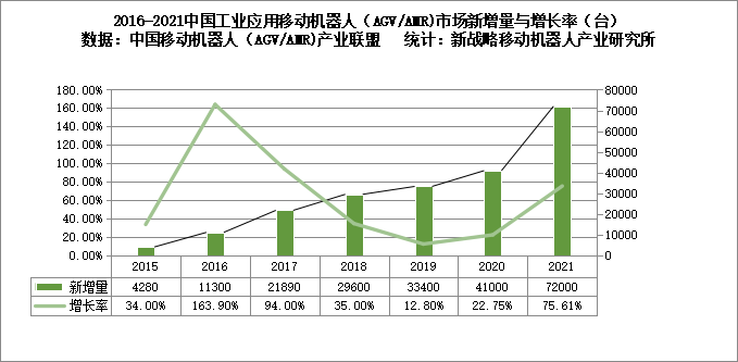 圖表:2015-2021中國市場企業(yè)工業(yè)應(yīng)用移動機器人(AGV/AMR)新增量(臺)與增長率