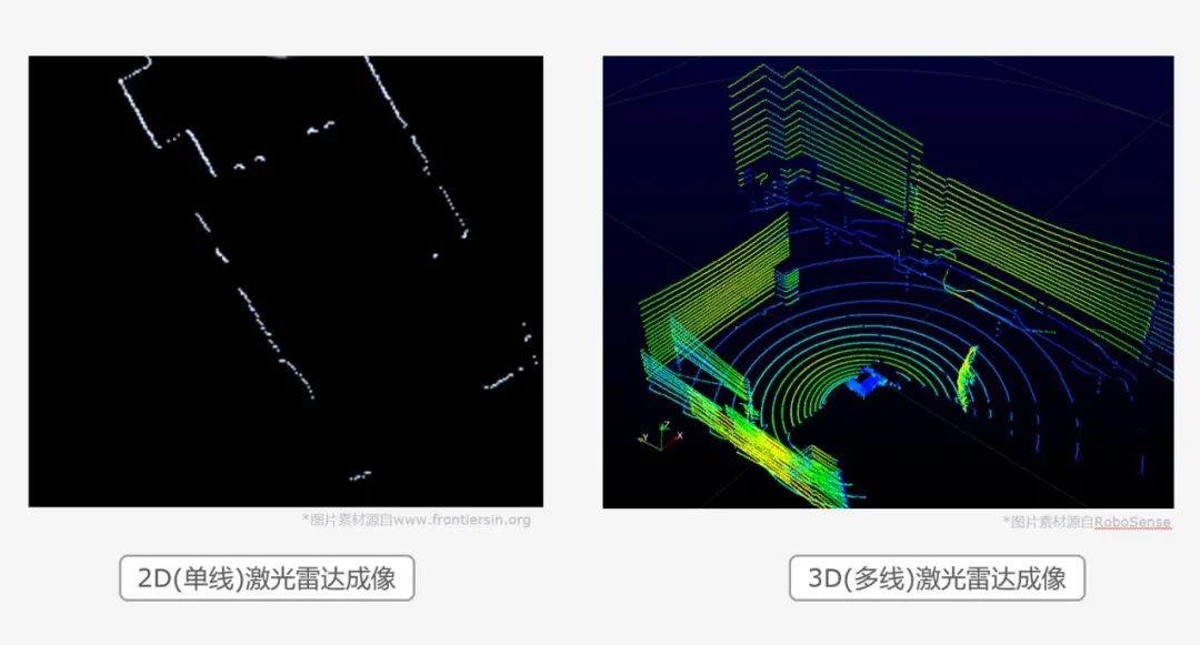 注:2D(單線)激光雷達成像(左);3D(多線)激光雷達成像(右)