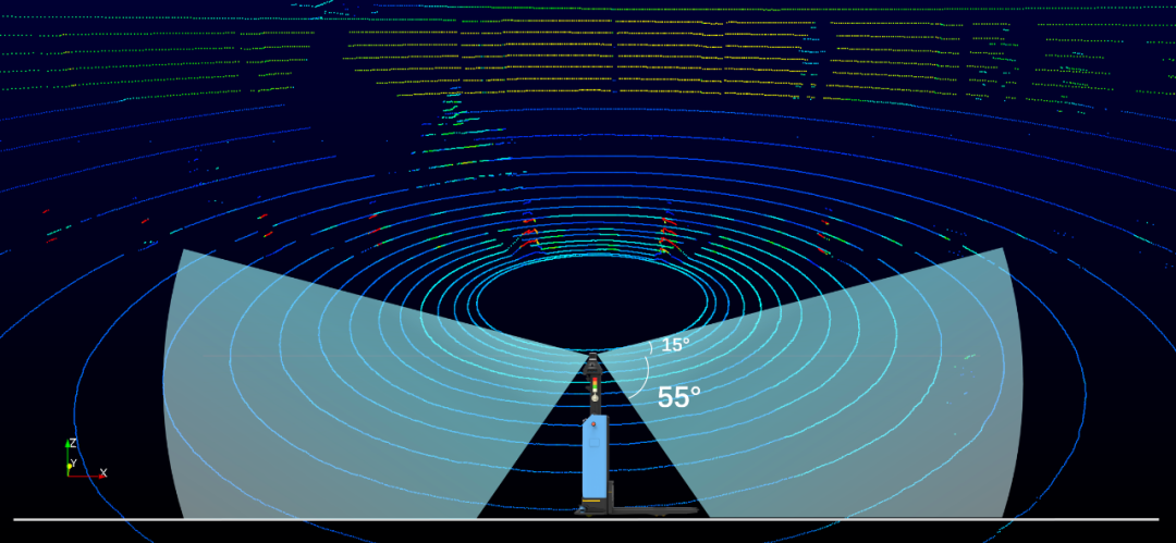 注:部署于仙工智能自動叉車的 RS-Helios 垂直視場角示意圖與室外實時三維成像點云