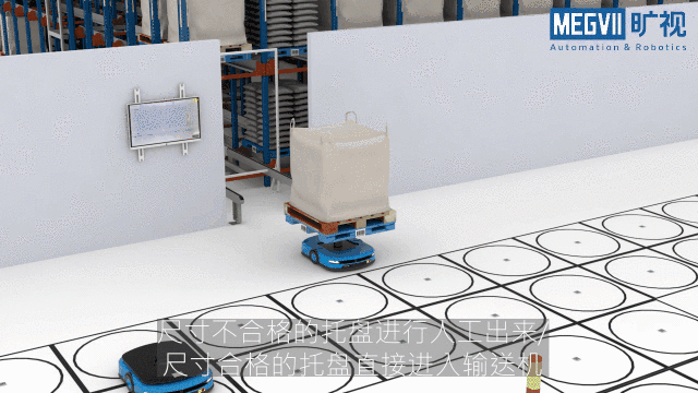 3.成品入庫:噸包形態貨物,通過震實、稱重、抽氣熱封等流程后進入外型檢測裝置;小包形態貨物,碼垛后進入外型檢測裝置。尺寸合格的托盤,通過AMR搬運到指定巷道口入庫,再由提升機及四向車搬運上架。軟件系統更新庫存信息。
