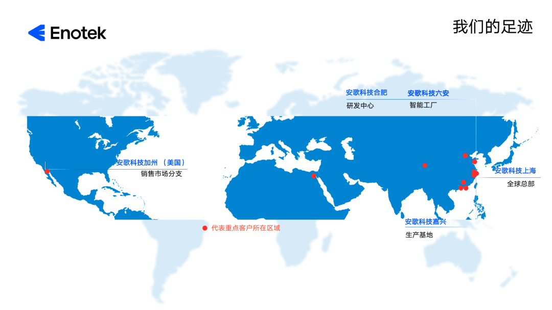 安歌科技Enotek成立于2008年,全球總部位于上海,除了正在建設中的六安數智倉儲物流系統智能工廠,在嘉興還建有生產基地,在合肥設有研發中心,在美國擁有子公司,業務遍及全球20+國家及地區2023年,安歌科技還將不斷踔厲奮發,持續開拓海外業務市場,讓中國智造走向世界。