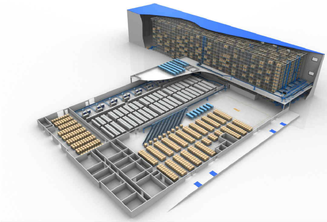 1、含有5臺高22米的堆垛機的ASRS存儲系統(tǒng),共10,080個托盤貨位;