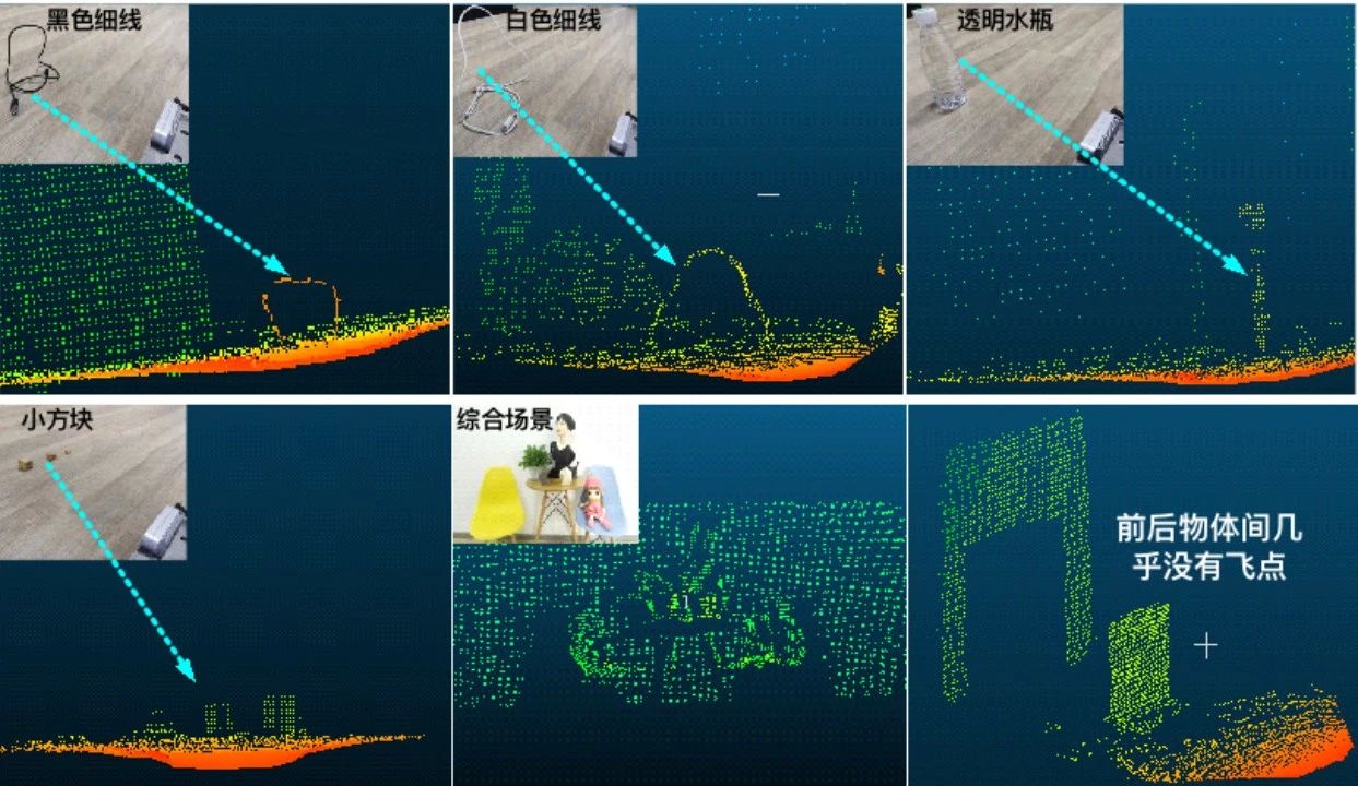 實拍場景與3D點云,可以看到dToF不僅在綜合場景中表現(xiàn)優(yōu)秀,對小物體,細(xì)線甚至透明物體等極端場景都有非常好的表現(xiàn),并且相對于其他ToF技術(shù),dToF在飛點(前后物體邊界難以區(qū)分造成的)的表現(xiàn)上有天然優(yōu)勢。
