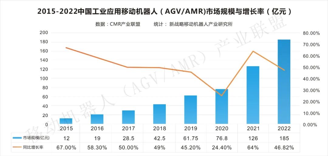 根據CMR產業聯盟數據,新戰略移動機器人產業研究所統計,2022年度,中國工業應用移動機器人(AGV/AMR)銷售數量93000臺,較2021年增長29.17%,市場規模達到185億元,同比增長46.82%。