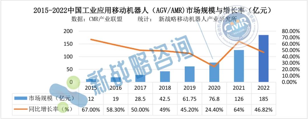 2015-2022中國(guó)工業(yè)應(yīng)用移動(dòng)機(jī)器人(AGV/AMR)市場(chǎng)規(guī)模與增長(zhǎng)率