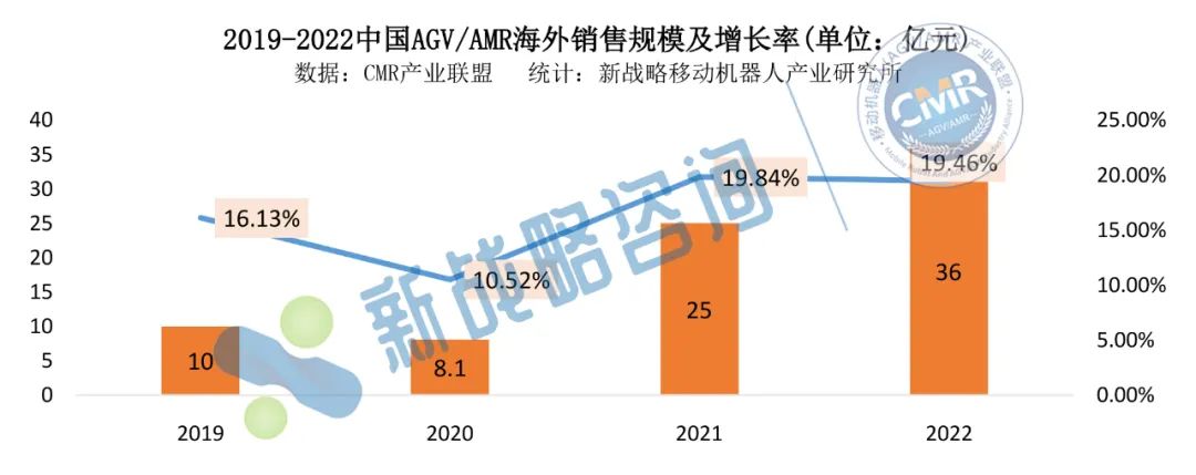 2019-2022中國(guó)AGV/AMR海外銷售規(guī)模及增長(zhǎng)率(單位:億元)