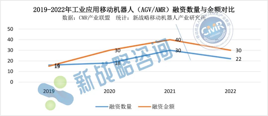 圖表:2019-2022年工業(yè)應(yīng)用移動(dòng)機(jī)器人(AGV/AMR)融資數(shù)量與金額對(duì)比