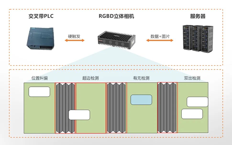為提高交叉帶用戶關注的訂單精準度,分揀機效率,避免錯分和包裹無謂循環。灰度除雙糾偏儀3D視覺產品MV-DB500S-C,專為快遞物流行業中交叉帶分揀場景打造,相機可同時獲取被測物的二維和三維信息,并內置自研的3D圖像處理算法及深度學習定位分割算法,對交叉帶上包裹數量和位置做出精準檢測判斷。