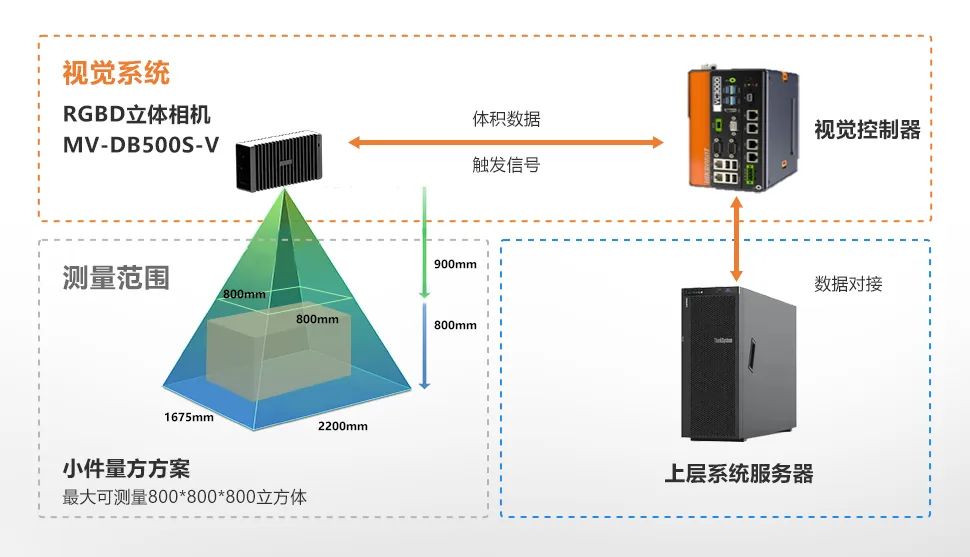 物流電商企業在包裹入庫、出庫時,需采集物體的體積信息。小件靜態量方產品MV-DB500S-V和大件靜態量方產品MV-DB1300A專為物流場景打造,多種測量方案可覆蓋全場景的體積測量需求,基于深度圖和RGB圖輸出更為精準的體積測量數據,同時擁有深度學習功能,支持包裹分類、薄件測量、以及更強的抗干擾能力。