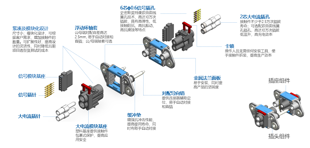? 模塊化設計,可以根據用戶需求,配置不同的電源(70A/200A)、信號等類型接觸件,可實現定制化配置和滿足快速充電及通訊需求;