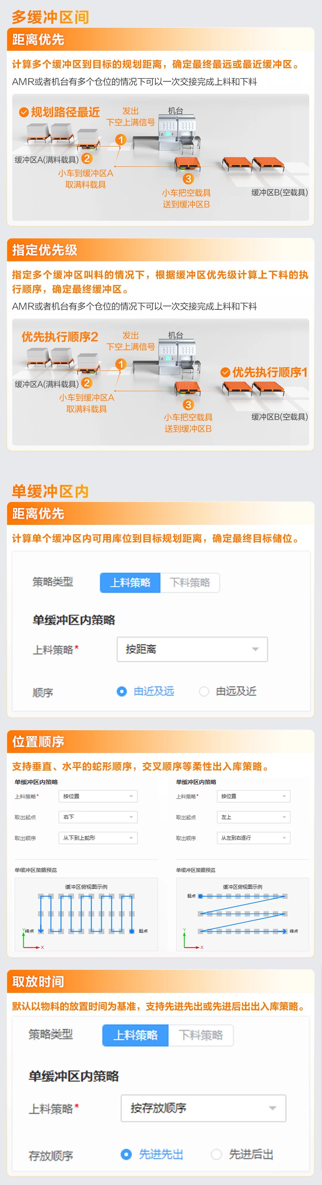 MCS提供緩沖區、線邊倉等生產物料暫存點的多種上下料策略,包括多個緩沖區間和單個緩沖區內的上下料策略,靈活適應多種業務需求。
