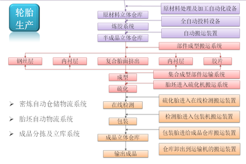 一、打造智能一體化輪胎生產解決方案要了解陸宇的物流倉儲需求,就必須了解其橡膠輪胎的生產過程。簡單來說,橡膠生產的智能化升級主要體現在子午胎全自動成型系統、子午胎全自動硫化機組、智能存儲物流系統三個方面,具體包括煉膠、材料制備、半成品存儲、成型工序、胎坯存儲、硫化工序和成品存儲。