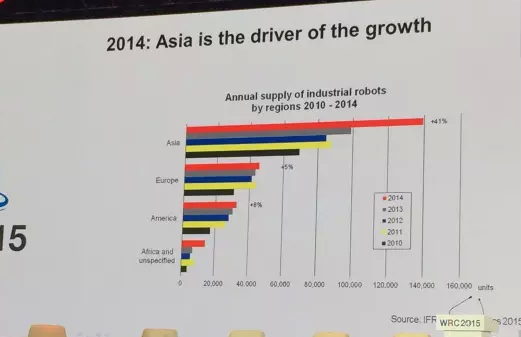 到底有多少機器人在工廠里工作?(圖)2014、2015年差不多超過150萬個左右,預測未來三年將有230萬的機器人在工廠中得到應用。并且,我們對亞洲進行了預測,其中一半機器人將出現在亞洲。