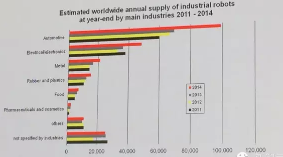 哪些使用機器人非常重要的的行業呢?主要驅動力是汽車業。這是傳統的機器人應用行業,汽車行業是機器人最開始得以應用的一個行業。在去年銷售的23萬個機器人當中10萬個應用于汽車行業。第二大使用機器人的行業是電子行業,接下來還有金屬、橡膠、食品、制藥、化妝品等等行業,這些行業都是應用機器人的行業。