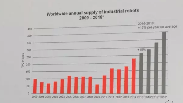 世界工業機器人年度供應情況(2000-2018),可以看到最近幾年出現了發展的峰值,而且在接下來幾年會有進步的、長足的發展。2015年的數據還沒有出現,2014年全球銷售的工業機器人達到23萬個,今年會有15%的增長。在接下來幾年會有更大增長,因此在工業機器人數據上會有持續的兩位數的增長。