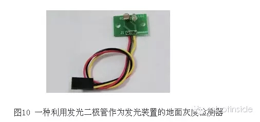 可見光地面灰度檢測器,就是使用一個發光裝置與一個光敏電阻搭配,裝在機器人底部離地面較近的一個位置上。發光裝置發射可見光,照射到不同顏色上面后,反射光的強度會有一定的差異,根據光敏電阻的返回值便可知道機器人下方的地面顏色(圖10)。