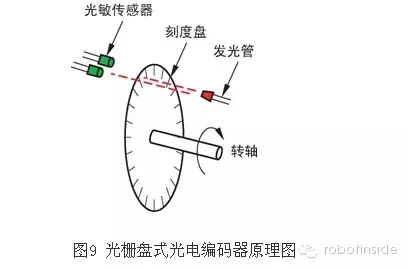 透射式檢測原理與反射式相似。唯一的不同是它沒有圖9中黑白相間的碼盤,而是在光柵圓盤上開了一圈小孔,紅外線或可見光的發射端與檢測端分別位于光柵圓盤的兩側(圖9),同樣利用光柵圓盤旋轉后產生的脈沖信號來檢測電機的旋轉速度。