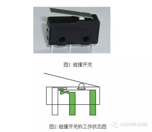 最典型的接觸式測障傳感器便是碰撞開關(圖1)。碰撞開關的工作原理非常簡單,完全依靠內部的機械結構來完成電路的導通和中斷。當碰撞開關的外部探測臂受到碰撞,探測臂受力下壓,帶動碰撞開關內部的簧片撥動,從而電路的導通狀態發生改變(圖2)。