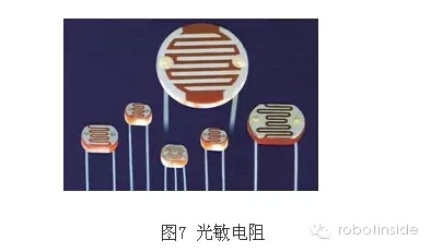 很多朋友制作的機器人都需要判斷環境光的亮度,這時就需要亮度傳感器。最常用的便是光敏電阻(圖7)。光敏電阻是一種隨著照射在上面的可見光強度變化而阻值發生相應變化的電阻,可以根據其阻值的變化判斷出光強。