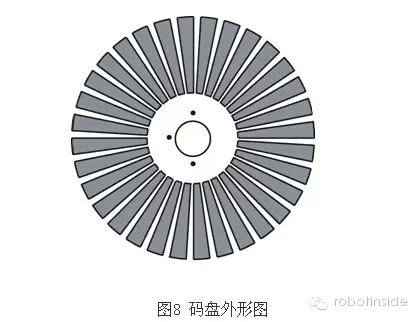 反射式的基本結構是在電機的旋轉軸上加一個圓形的黑白相間碼盤,很多都是粘在輪子上的(圖8),離碼盤很近的地方固定一個紅外發射/接收一體模塊,利用黑白色對紅外線的吸收率不同來進行判斷。紅外線照射到黑色部分時,大部分被吸收,而無反射信號;紅外線照射到白色部分時,大部分紅外線被反射回來,而產生強烈的反射信號。當碼盤隨電機旋轉時,紅外接收端的輸出信號便是一個由旋轉速度決定頻率的方波,進而我們便可知道此時電機的旋轉速度。