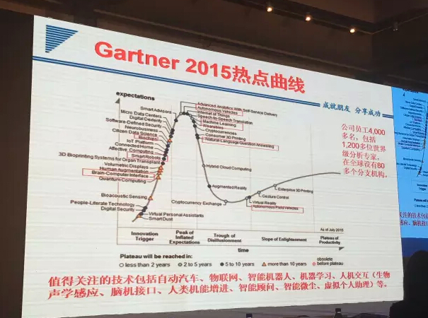 Cartner是一家擁有4000多名員工、1200多位世界級分析專家的公司,每年都推出熱點曲線,闡釋全世界的熱點,它值得關注的技術包括生物芯片、量子計算、生物3D打印、虛擬個人(助理)、智能車、物聯網、機器學習、自然語言理解等等,其中3D打印、特種服務機器人、虛擬現實依然是現在的熱點,代表經濟學家和金融界對這個方向的憧憬。根據行業不同,這條曲線有所變化,比如智能硬件的曲線很窄,因為它強調體驗,投資要求的變現時間更短,如果是工業機器人,這條線要長一點,投資會比較緩慢。