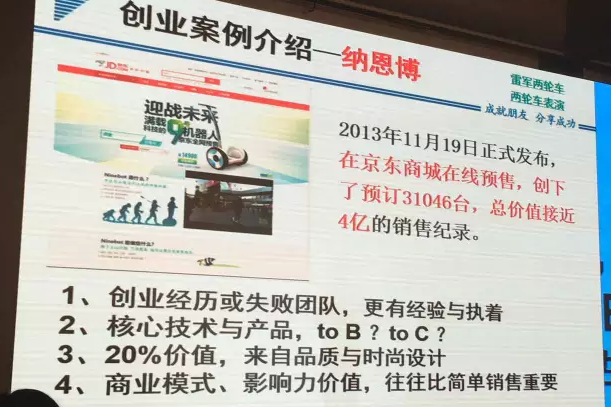 Ninebot,就成為了智能綠色短交通領導者。作為一種全新的智能個體代步工具,兼具多重機器人屬性。這款產品原來TO B,后來轉為TO C,而且定位高端,后來拿到小米、紅杉的融資,并收購了美國賽格威。除了線下和海外市場,它2013年11日19日正式在京東商城在線預售,預訂了3萬多臺,總價值接近4億銷售,可見渠道開拓非常重要。