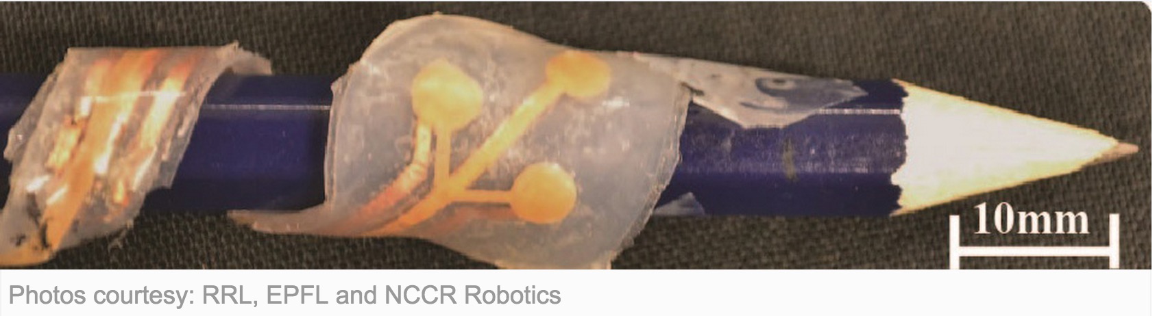 “機械矯正器”(機械外骨骼)讓那些由于各種各樣原因受創傷的病人可以恢復運動能力,但是很多的這類設備穿戴起來不太舒服并且很笨重,所以還沒有成為普及型的應用。要想讓這類設備成為日用的、實用的東西,它們表面的觸覺界面必須要輕巧、柔順、安全并且有大量的感知和刺激點才行。一個由RRL, EPFL 和NCCR Robotics組成的團隊,近日出品了一個“軟性氣動裝置(SPAs) 皮膚”,內嵌“壓電式傳感器(PZT)”,它可以處理這些問題并且提供“震動觸覺反饋”。