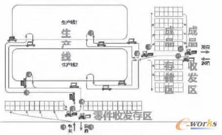 本文所要研究的實(shí)例是給1家主機(jī)廠供應(yīng)配套產(chǎn)品的零部件工廠(簡(jiǎn)稱A工廠),位于經(jīng)濟(jì)發(fā)達(dá)的沿海地區(qū),A工廠坐落在主機(jī)廠的供應(yīng)商園區(qū),廠房占地面積約1萬(wàn)平方米,擁有兩條生產(chǎn)線,從功能上可將廠區(qū)劃分為零件收發(fā)存區(qū)域、生產(chǎn)線、成品存儲(chǔ)區(qū)和成品發(fā)貨區(qū),工廠布局示意圖,如圖1所示。