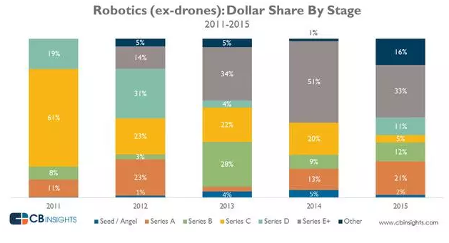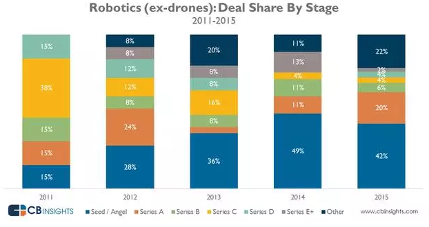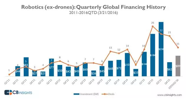 機器人行業獲得的投資從2014年45筆增長至2015年的83筆。增長率達到115%,高于前一年的55%。