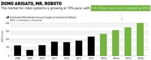與《中國制造2025》相關的智能制造專項規劃和機器人“十三五”規劃在完善之后有望于2016年一季度中后期出臺,估值壓力緩解和政策預期支撐智能制造板塊反彈。智能制造這個主題已經迎來了從概念到成長性轉變的契機,相關上市公司有望迎來高速增長.據《2015年世界機器人報告》,從2009年開始,工業機器人市場規模就呈擴張態勢,目前未見放緩趨勢。2014年,工業機器人市場資產規模約為320億美元,未來數年中,預期該規模將以最少15%的復合年均增長率(CAGR)繼續增長。視覺資本網站(Visual Capitalist)創始人Jeff Desjardin稱,這意味著,從2015年到208年,全球將有130萬工業機器人投入市場。屆時,市面上的操作型機器人將超過230萬,預期集中在汽車和電子行業。